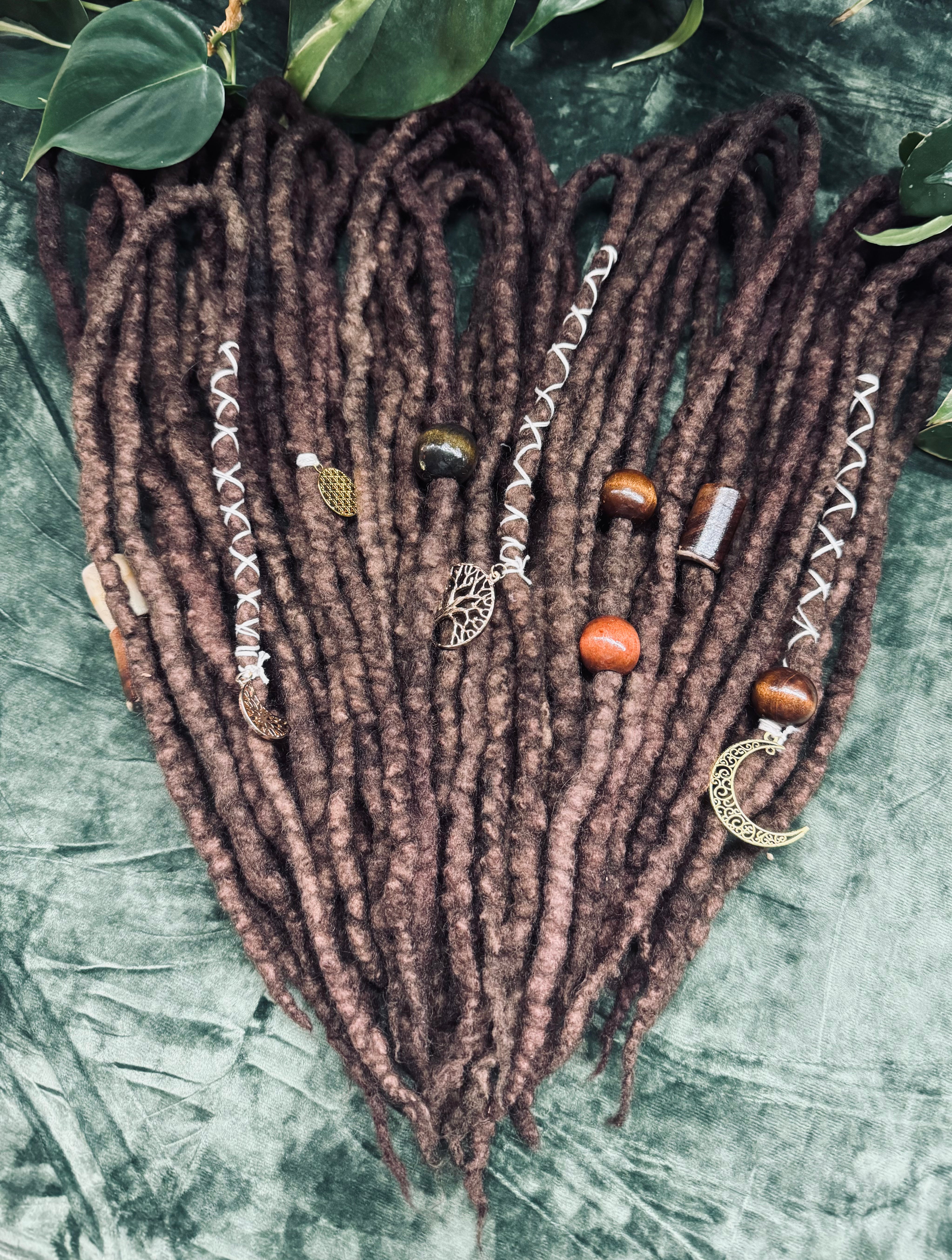 Dyed in deep, earthy tonal browns, each dread features subtle variations in shade to create depth, movement, and an effortlessly natural appearance. No two are exactly alike, giving this set a beautifully wild, organic feel.