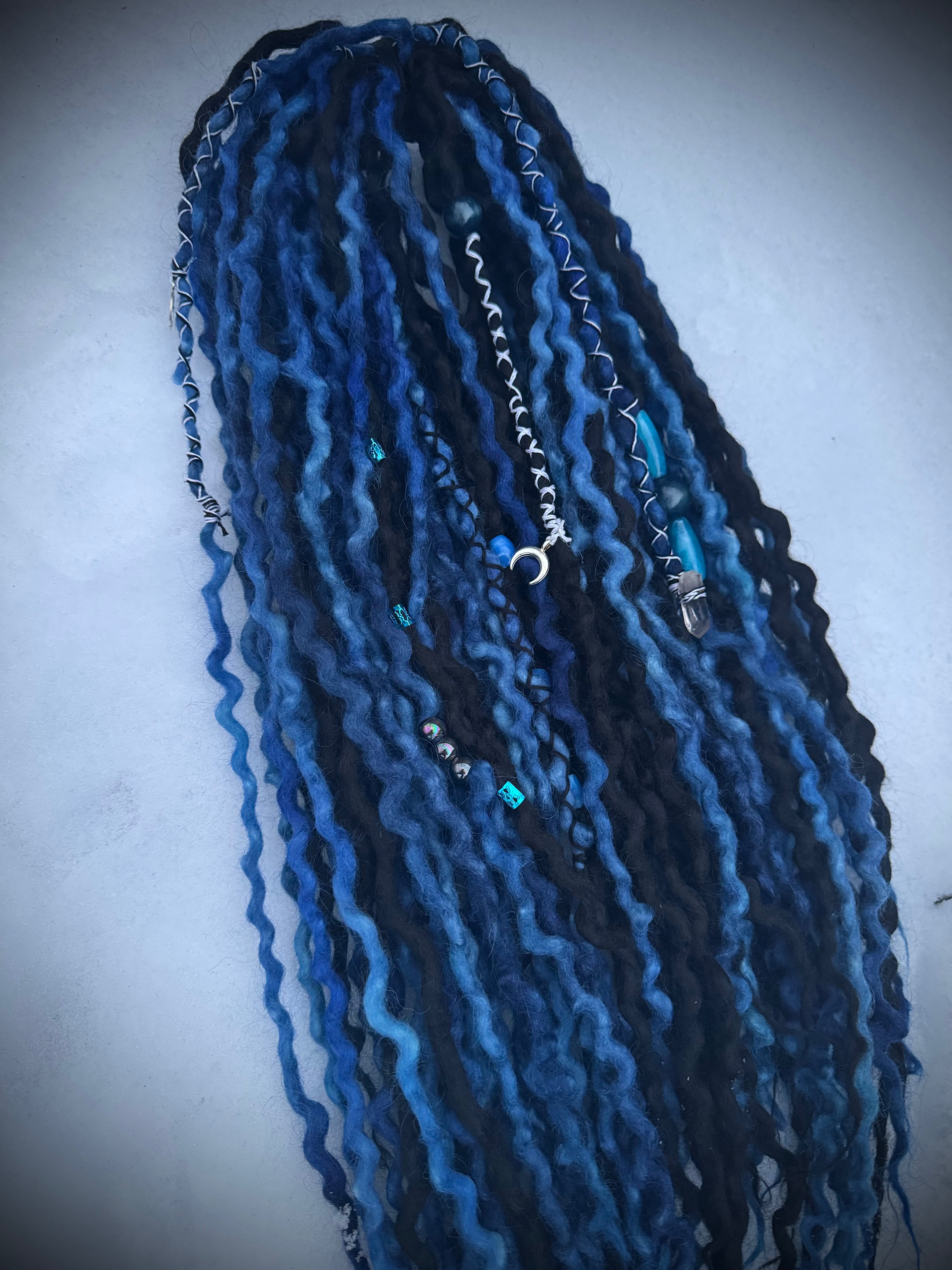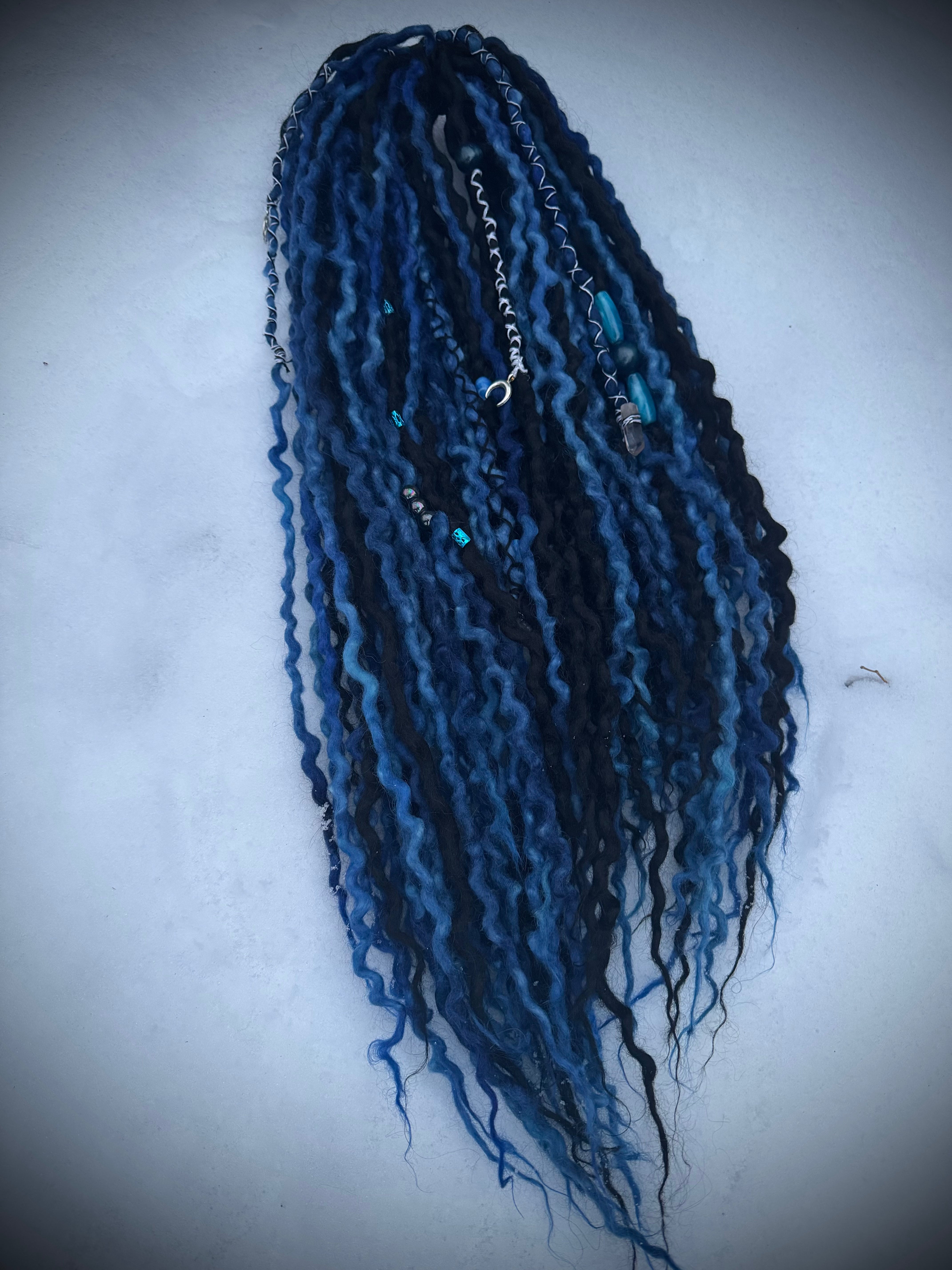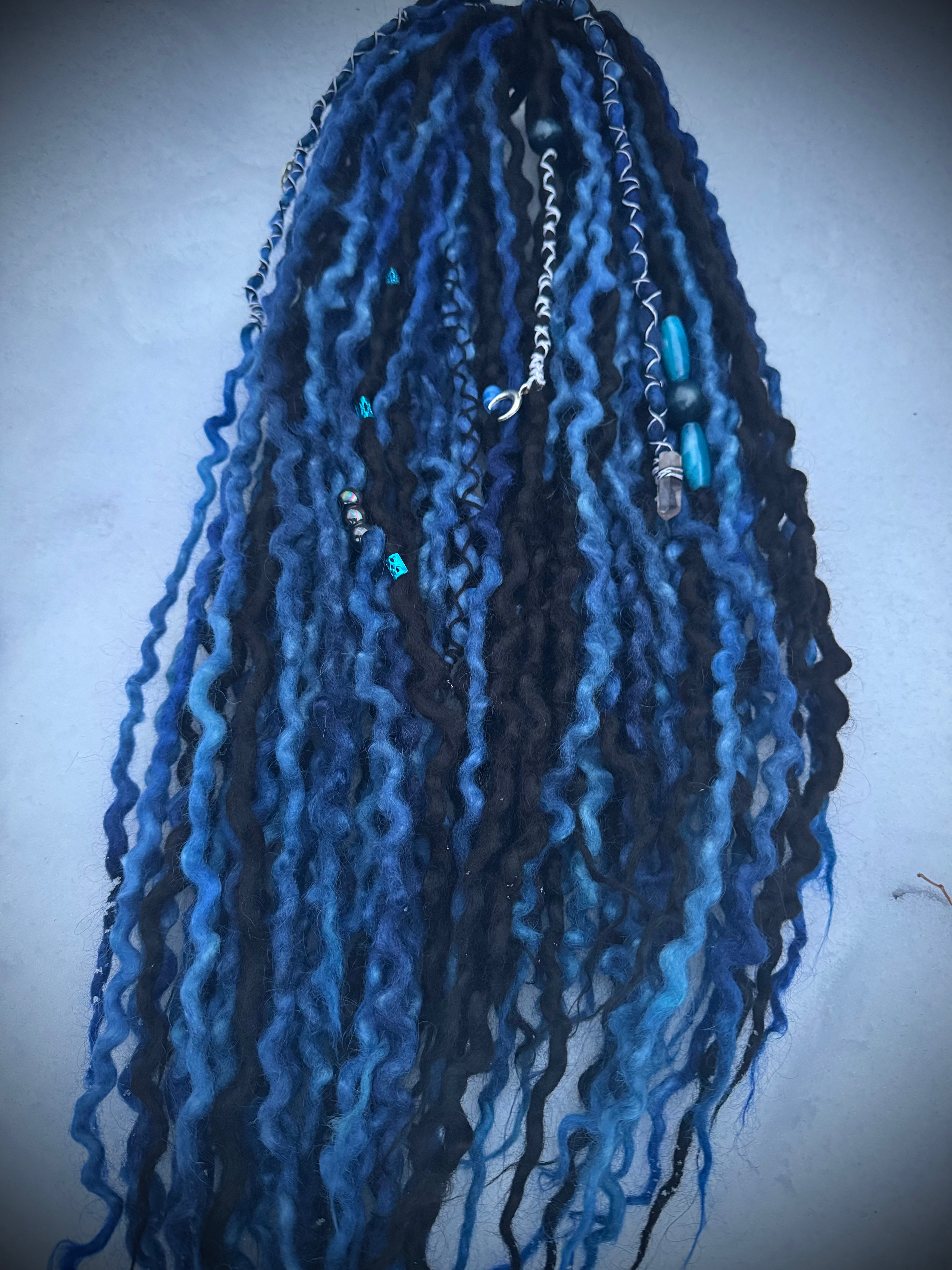 Slip into the shadows of winter with Frozen Eclipse — a handcrafted wool dreadlock set inspired by moonlit storms, icy skies, and the quiet magic of dark cold nights.