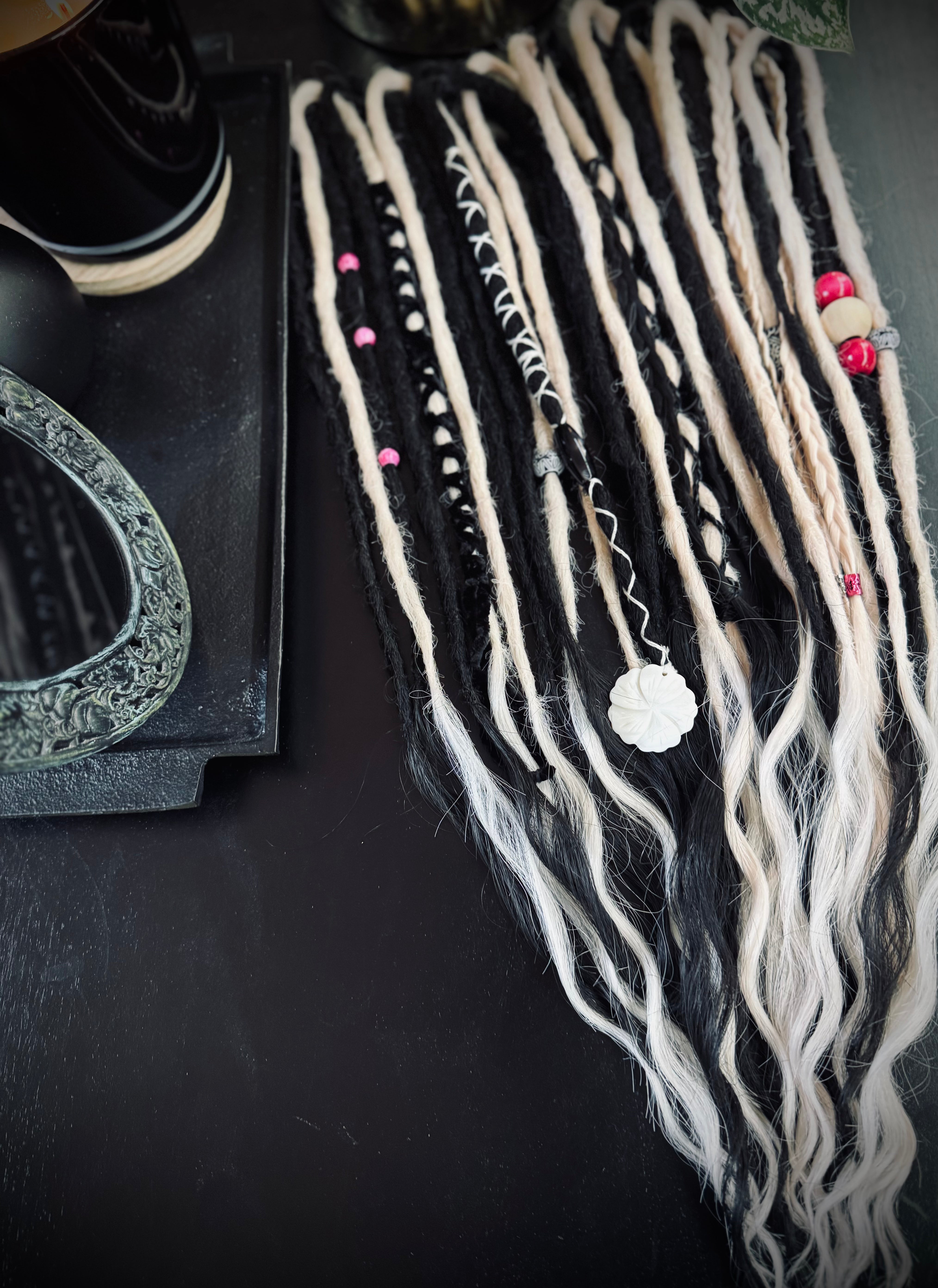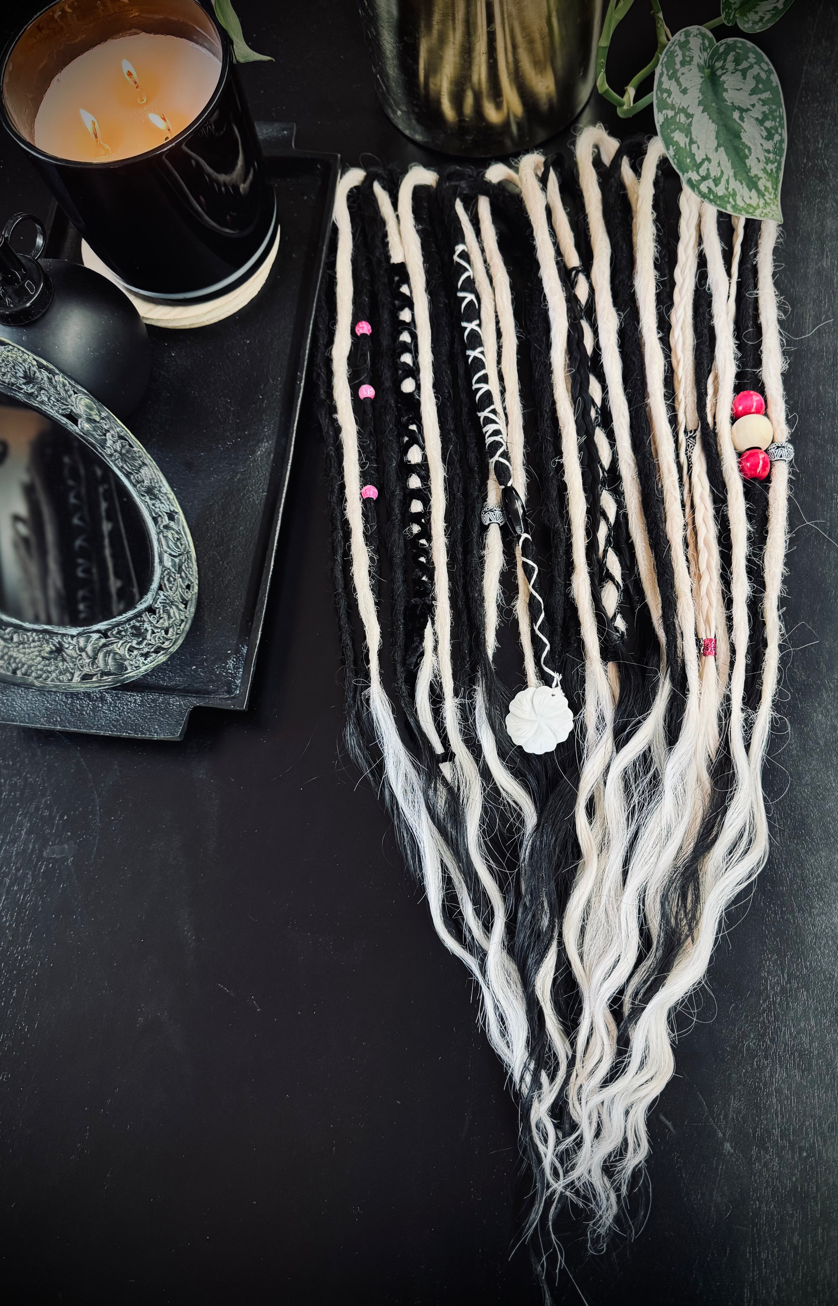 Bring a little bold magic to your look with this handcrafted set of dreadlock extensions. Featuring a striking mix of black and soft pink tones, these pieces are decorated with beads, wraps, and textured details that give the perfect balance of witchy edge and playful sweetness.